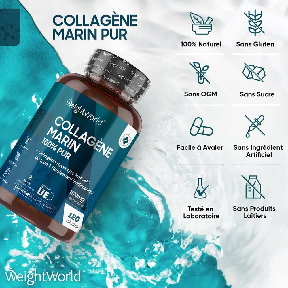Communément appelé collagène de poisson, le collagène marin ou collagène marin hydrolysé, est une protéine naturelle qui est extraite des écailles des poissons d’eau salée. Cette forme de collagène marin pur contient des molécules appelées peptides, qui sont bien connus pour leur petite taille moléculaire et leur poids. Ces particularités permettent au collagène marin d’être absorbé 1,5 fois plus rapidement que le collagène bovin et porcin. Il est donc rapidement devenu au fil du temps le collagène le plus populaire et le plus efficace pour le corps. En raison de la popularité du collagène marin pur en gélules, de nombreuses études ont été faites. Spécialement pour le lien entre ces peptides et la synthèse du collagène. Il est suggéré que le collagène marin pur s’avère très bénéfique pour ceux qui suivent un régime antioxydant et désirent préserver une apparence jeune.
