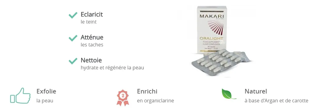 Les gélules Makari Oralight éclaircissent le teint de votre peau en amont. En effet, et contrairement aux crèmes décapantes qui agissent à postériori sur la mélanine déjà générée avec tout ce que cela peut comporter comme risques et contraintes, les gélules Makari Oralight permettent d’anticiper la production de mélanine et limitent sa production durant la phase de régénérescence de la peau. C’est ce qui explique sa plus grande efficacité et l’aspect naturel et uniforme de son action sur votre épiderme.